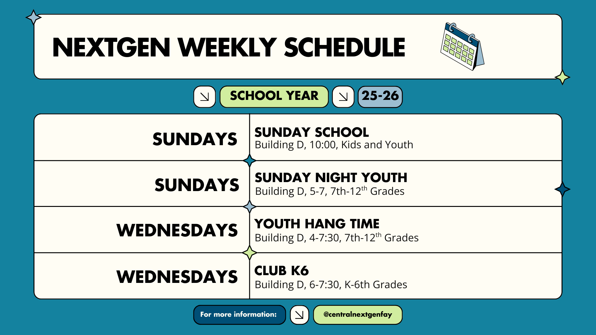 NEXTGEN PROGRAMS NextGen Programs meet Sundays and Wednesday nights. Youth meets on Sundays in building D starting @ 5 PM. Dinner is provided, so bring a friend and come worship with us! On Wednesdays, Club K6 is for Kindergarten - 6th