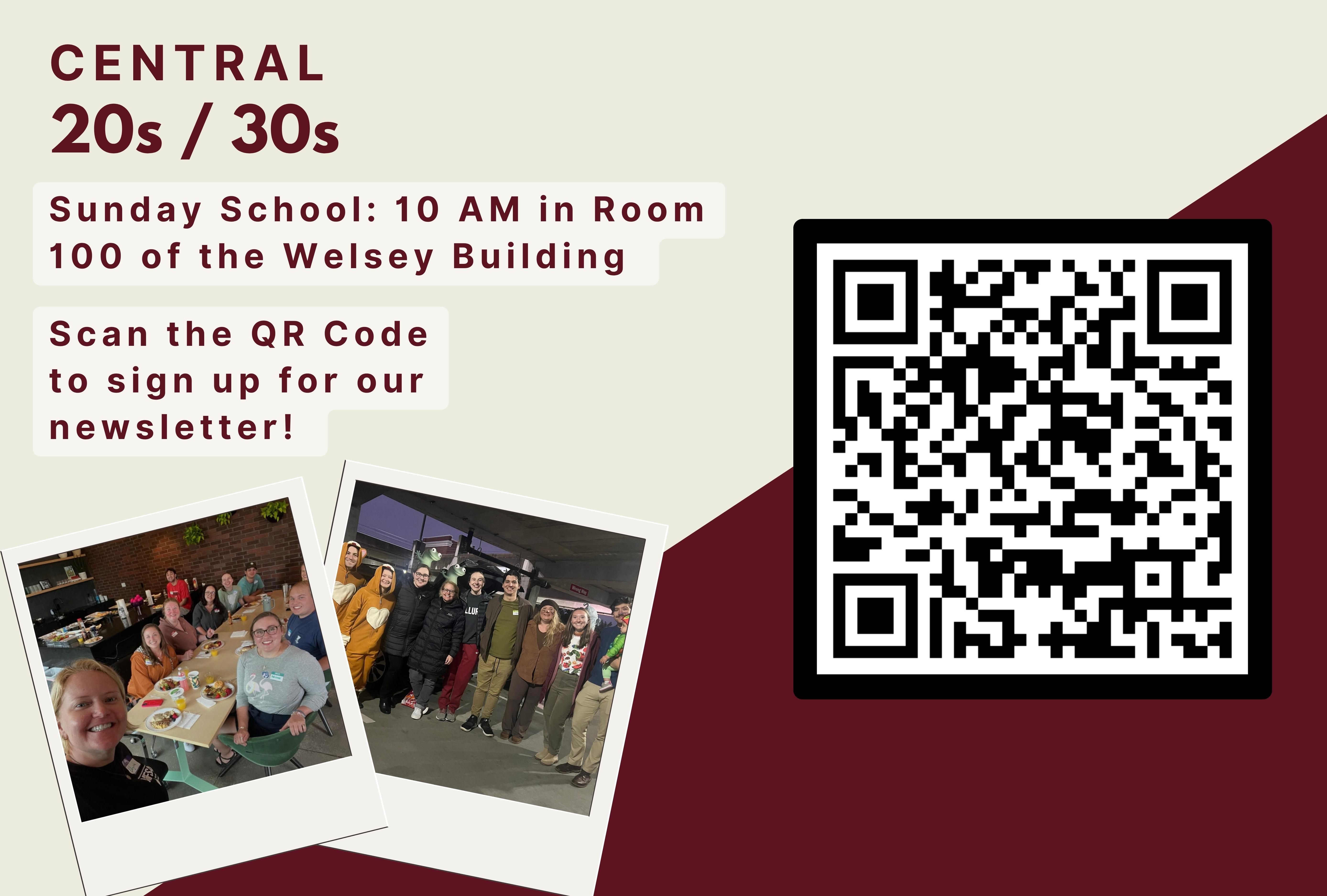 20/30'S GROUPIf you’re in your 20s or 30s and you’re looking for community of kind, curious, and enthusiastic folks, come check out the Central 20s / 30s group! We meet every Sunday morning @ 10 AM in room 100 and have a weekly walking