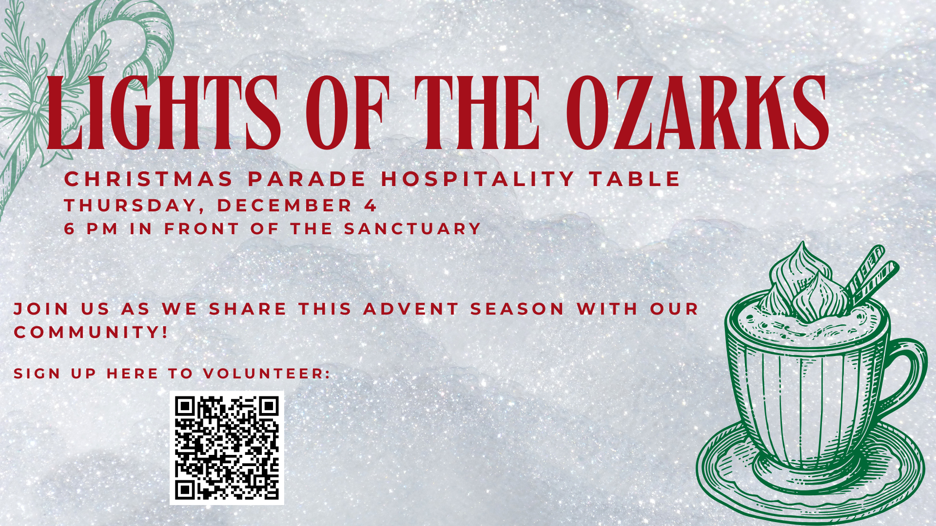 LIGHT OF THE OZARKS HOSPITALITY TABLEJoin us Thursday, December 4th, 6-8 pm as we welcome Lighting of the Ozark parade watchers. We will be serving hot chocolate and sharing information about our Advent services this December. Sign up here to volunteer.