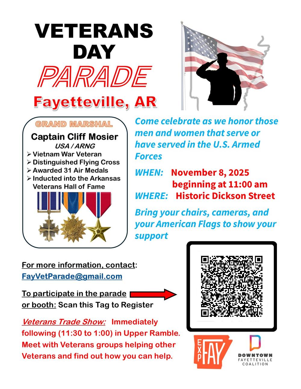 FAYETTEVILLE VETERANS DAY PARADEThe city of Fayetteville just announced this week that they will be hosting a Veterans Day Parade Saturday, November 8 @11am on Dickson Street. We invite the community to bring a chair and watch on Central's lawn as we honor those who have selfishly