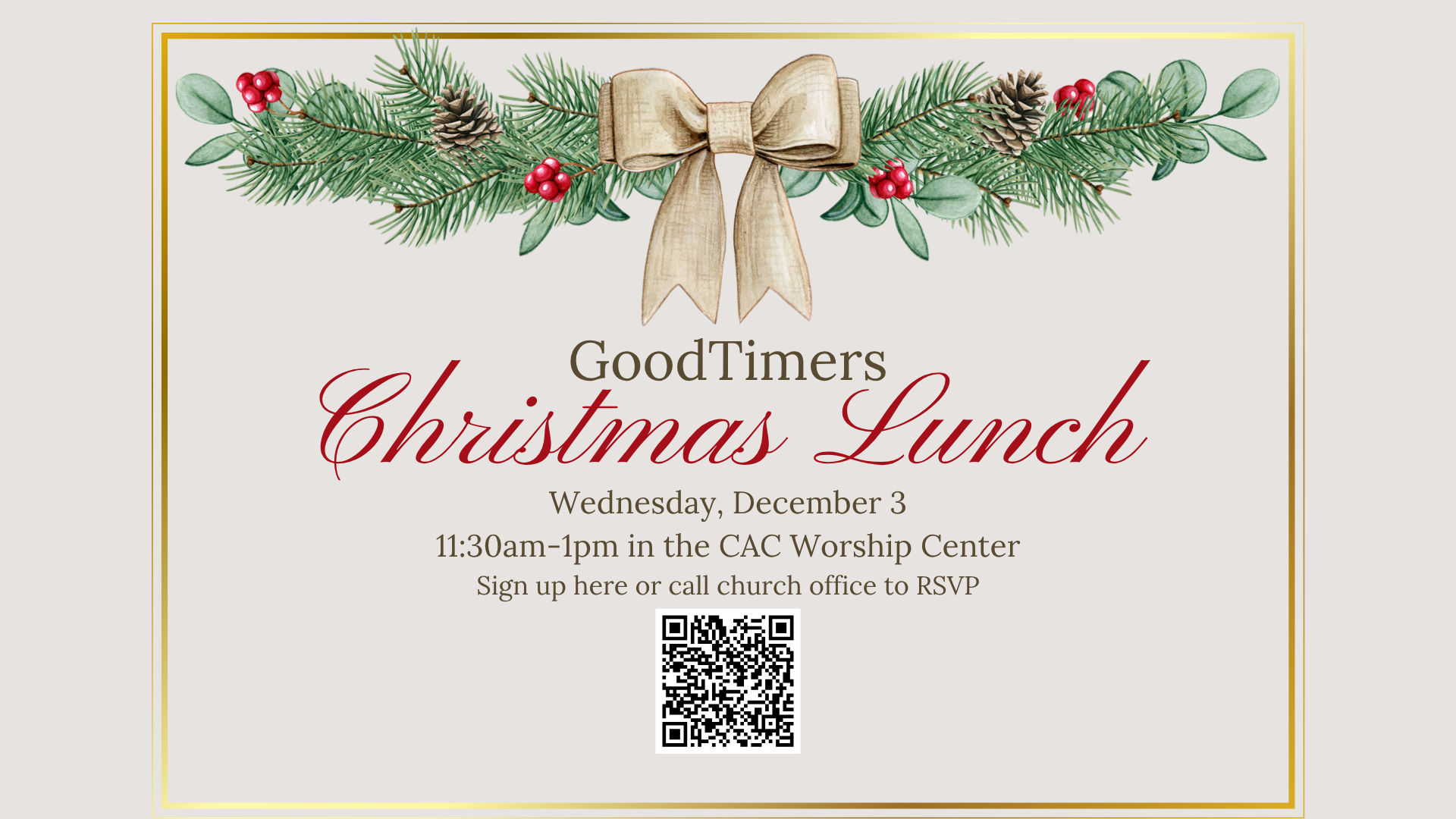 GOODTIMERS CHRISTMAS LUNCHGoodTimers Christmas Lunch is just around the corner! If you are 65 and up, join us for our annual Christmas GoodTimers Lunch. We will be singing Christmas carols and sharing in fellowship during the Advent Season. Be sure to sign up and we can't wait to see you! Sign up