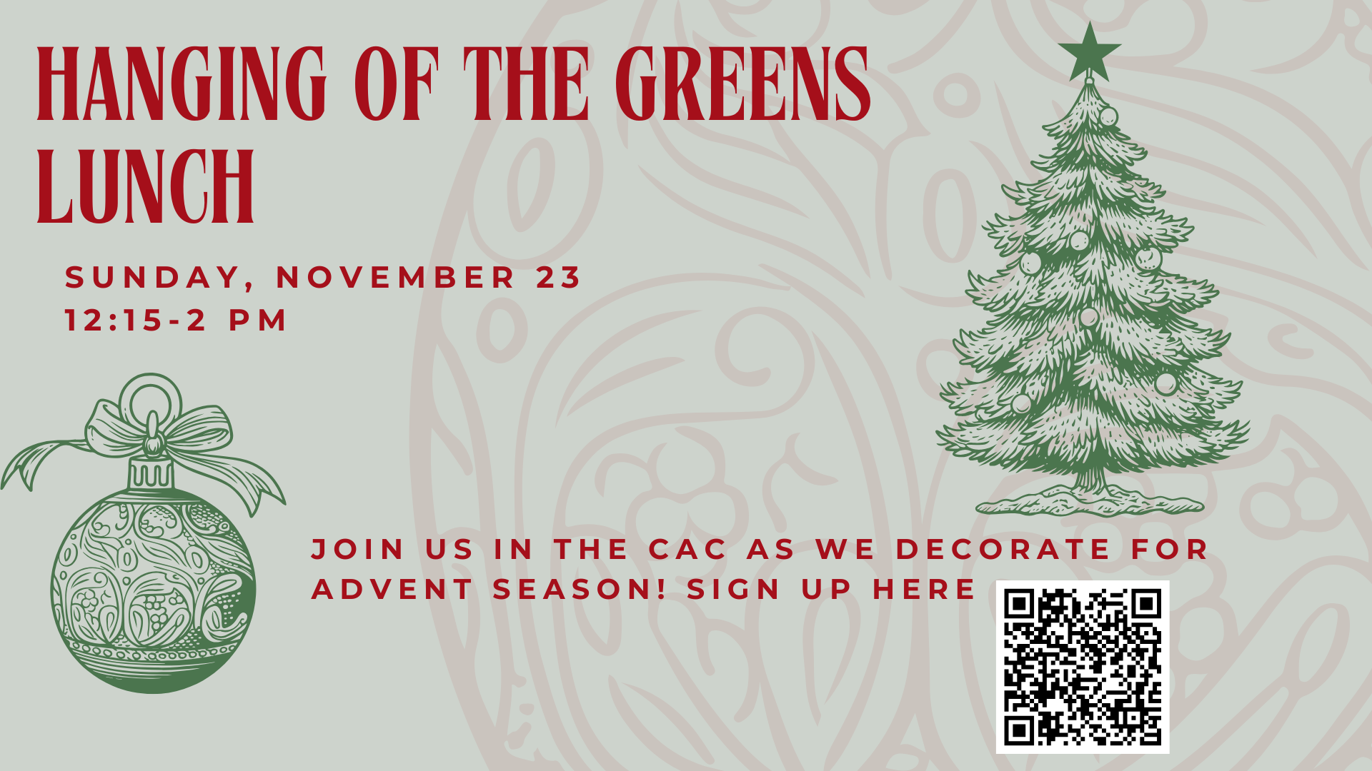 HANGING OF THE GREENSJoin us for our annual Hanging of the Greens on Sunday, November 23 following the classic service! We'll kick things off in the CAC with a pizza party and planning as we map out all the areas to be decorated for the Christmas season. Afterward, we'll