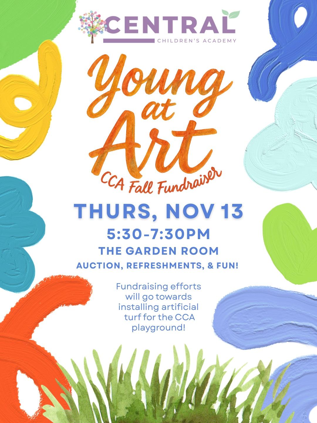 CCA YOUNG AT ART FUNDRAISEROur Central Children's Academy is hosting a silent auction fundraiser at the Garden Room on Dickson Street on Thursday, November 13 @5:30 pm. Proceeds will help us install artificial turf for the CCA playground, to make the fun a little safer! If you