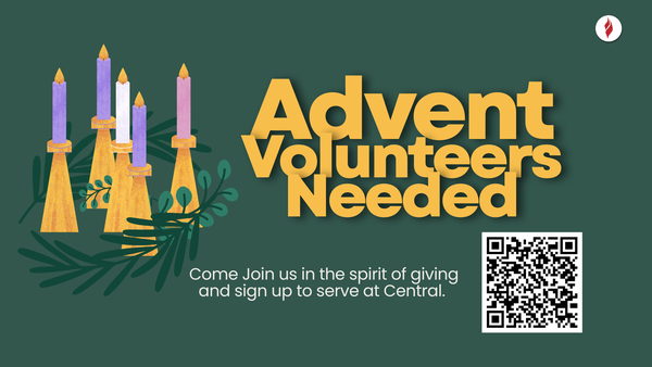 VOLUNTEERS NEEDEDAs we prepare for the Advent season and our growing congregation, Central needs volunteers in many areas for upcoming events and services. Come join us in the spirit of giving and sign up to serve at Central United Methodist Church. We are looking for ushers, AVP, Advent