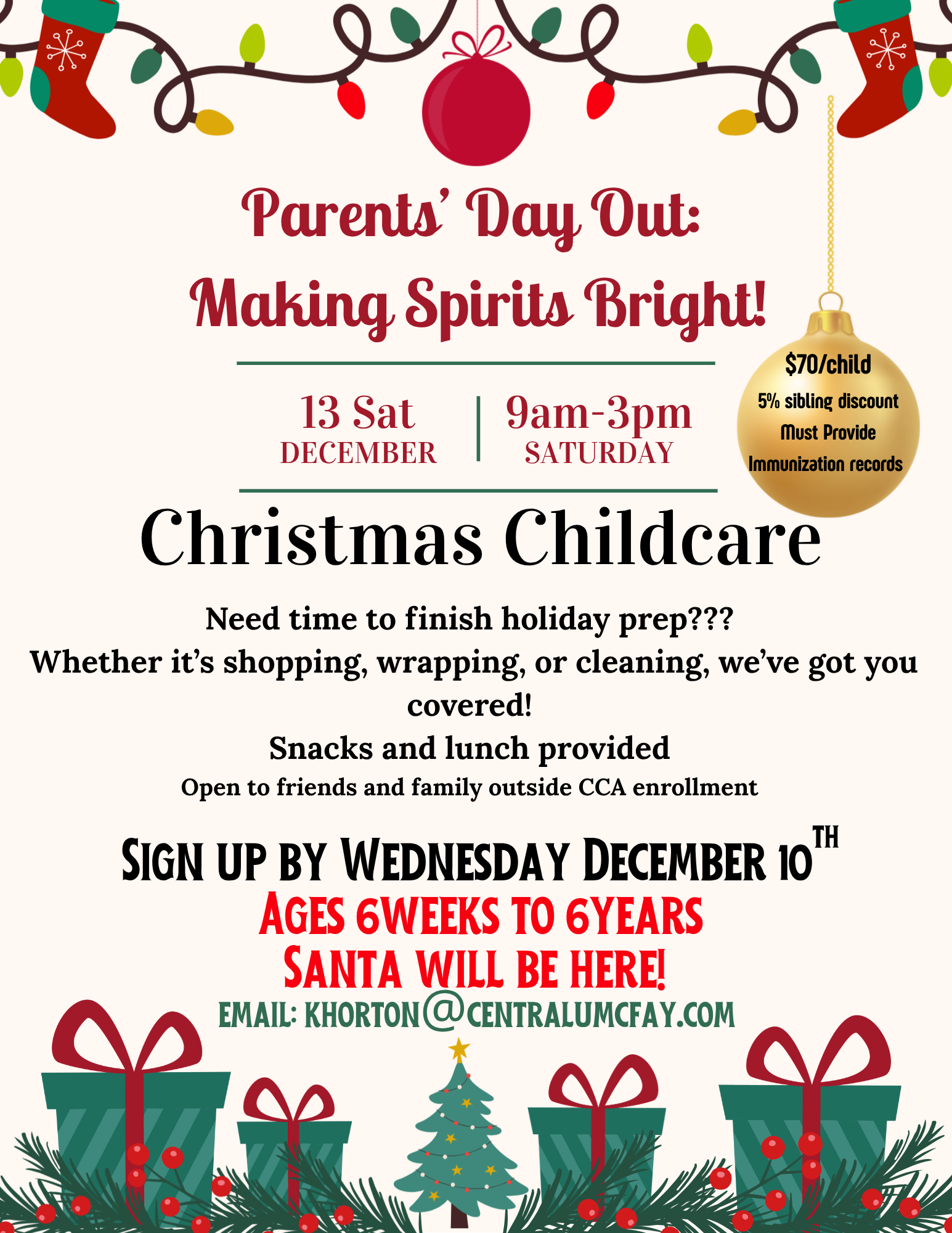 CCA Parents Night Out Need time to finish holiday prep? Whether it's shopping, wrapping or cleaning, the Central Children's Academy is here to help! On Saturday, December 13 on the 1st floor of the SMB, CCA will be hosting a Parents Day Out @9am-3pm