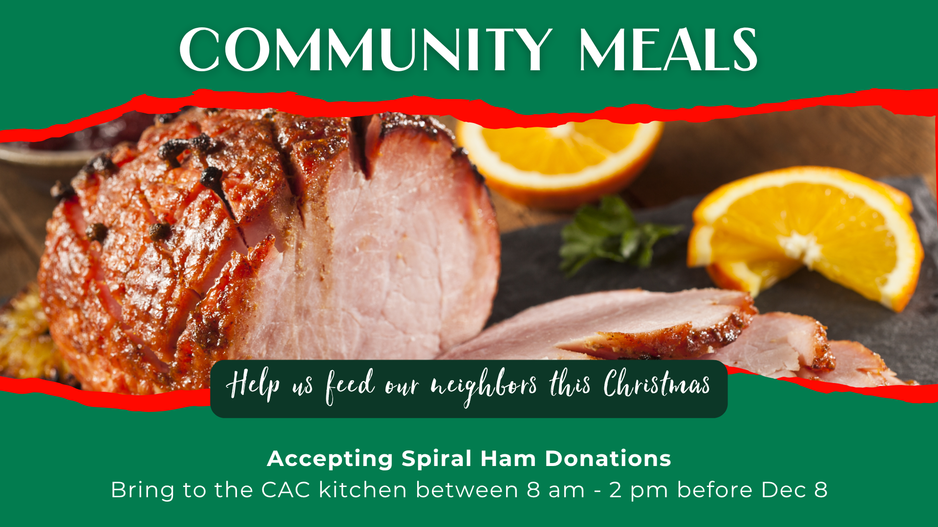 HAMS NEEDED FOR COMMUNITY MEALSWe are in need of spiral sliced boneless hams for our upcoming Community Meals Christmas Feast. Your contribution helps feed over 100 people each Tuesday and Thursday here at Central. Please contact the church office or Jeanie Hill to coordinate drop off. Drop off by December 8.