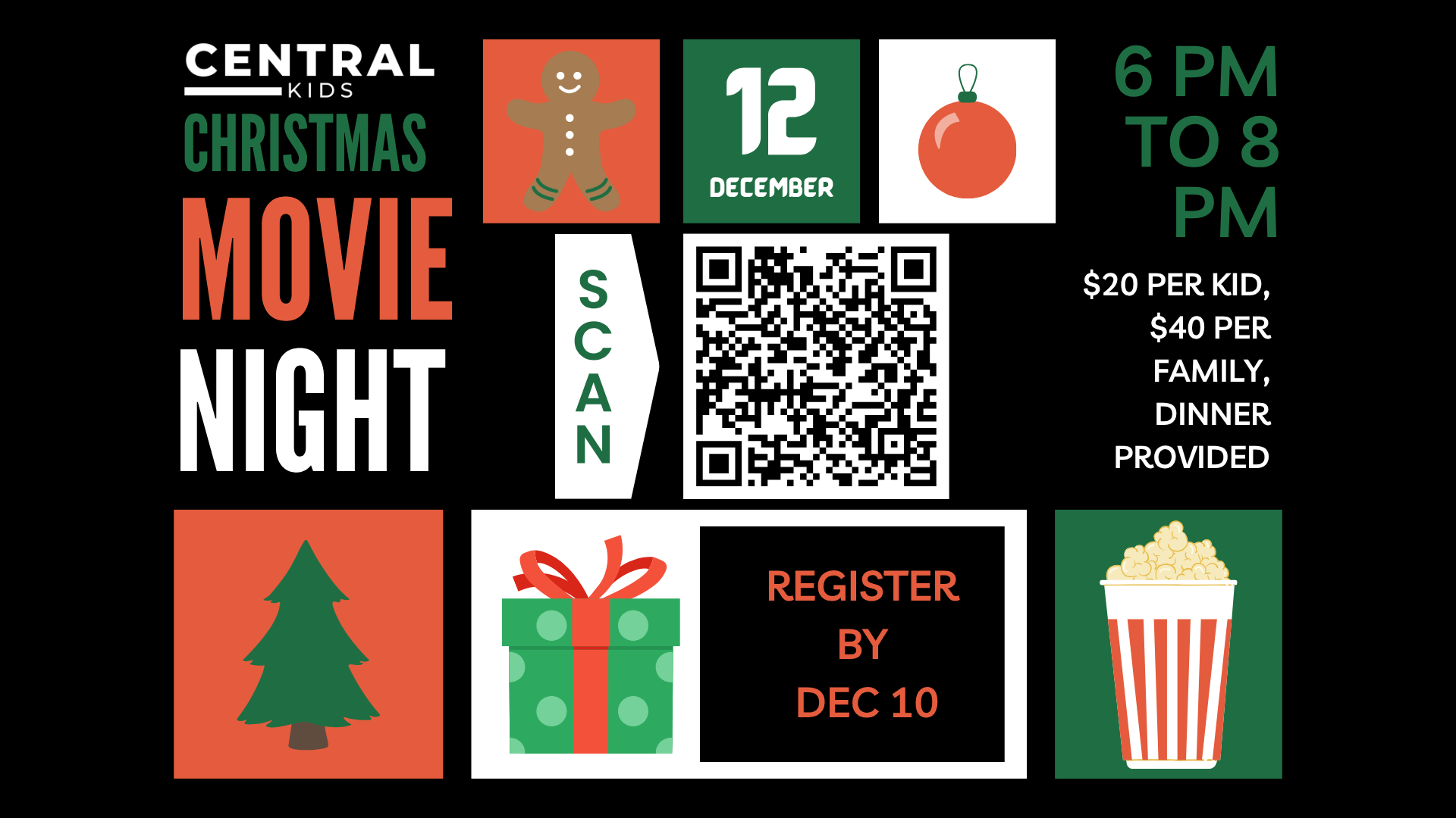 CENTRAL KIDS MOVIE NIGHTJoin us on Friday, December 12 from 6-8pm in the SMB for a Kids Christmas Movie! Registration includes dinner, popcorn, and hot chocolate. All proceeds will go to supporting our Kid's ministries. Come in your Christmas pajamas and enjoy