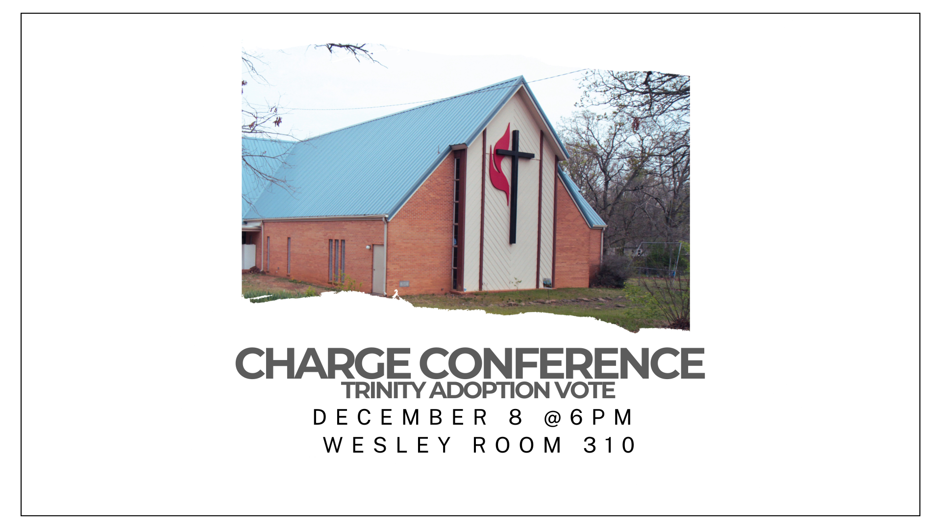 CHARGE CONFERENCE TO VOTE ON TRINITY On Monday, December 8 @ 6pm, Central Church Council will gather in Wesley room 310 for a called Charge Conference to vote on the adoption of Trinity United Methodist Church. We will discuss the adoption agreement and vote at that time whether to approve